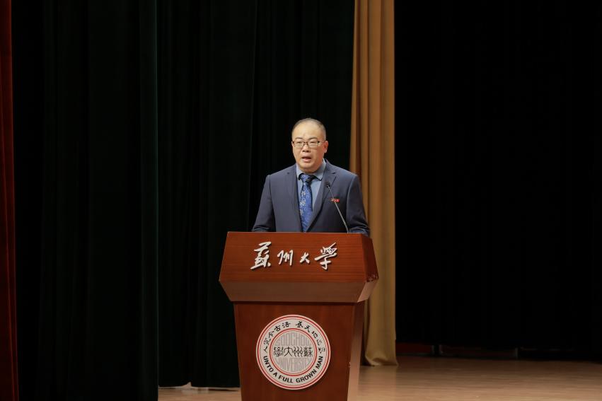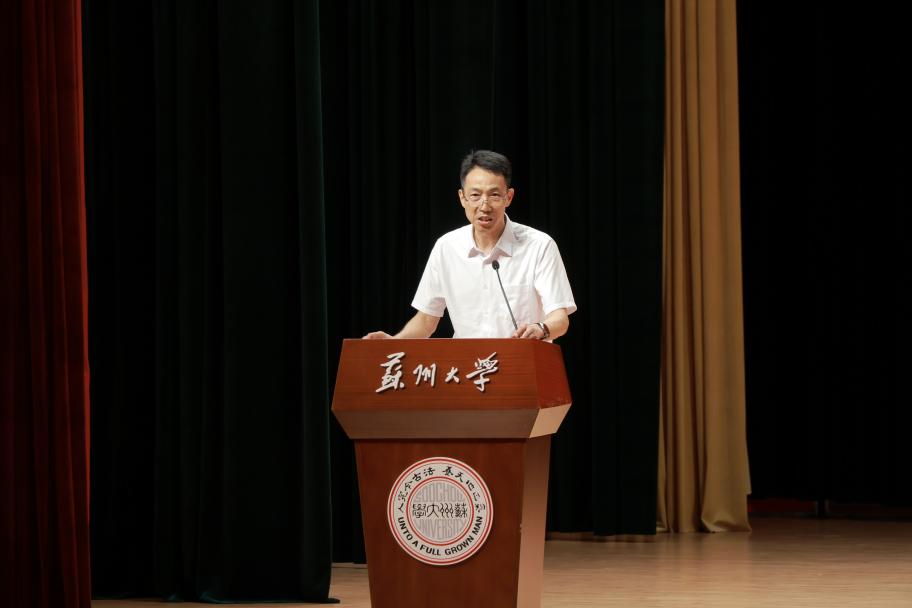 博士生导师陆阿明教授作为教师代表为新生寄语,对同学们提出了三点期望:一是回首过往,同学们要学会赞美自己,建立自信;懂得感恩,在感恩中奋进,厚植生命的厚度和温度。二是立足当下,要重视课程学习,勇于实践探索,学会与自己对话,不断取得新成就;三是憧憬未来,以今日之努力为笔,以苏大时光为卷,在知识的沃土中深耕不辍,在实践的浪潮里勇毅前行。他祝愿同学们,在苏大的日子里“既低头生根,也抬头望天”,以卓越之姿回报青春与期待!