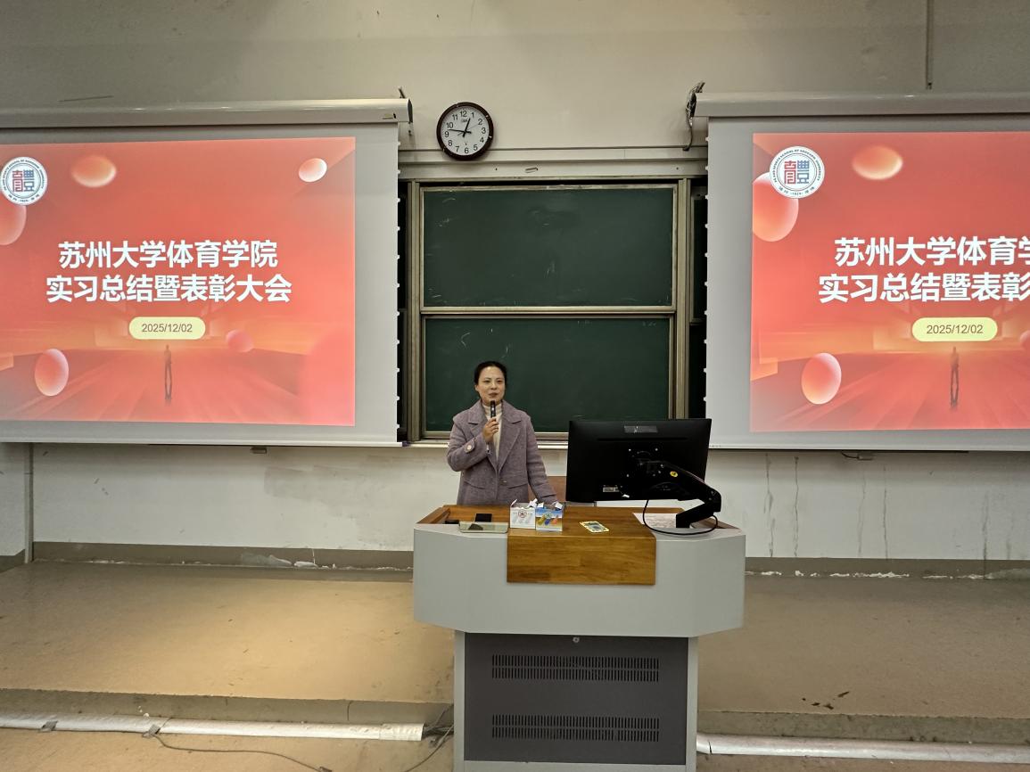 王妍副主任首先向全体实习生圆满完成实习任务表示热烈祝贺。她指出,实习期间,同学们始终秉持 “笃行实干、勤学善思” 的态度,直面一线教学、训练、健身指导中的各类挑战,在课堂组织、技能传授、科学训练、运动指导等实践场景中主动探索、积极提升,不仅扎实锤炼了专业技能,更展现出苏大体育学子吃苦耐劳、奋勇争先的优良作风,用实际行动诠释了新时代体育从业者的责任与担当,实习成效值得充分肯定。
